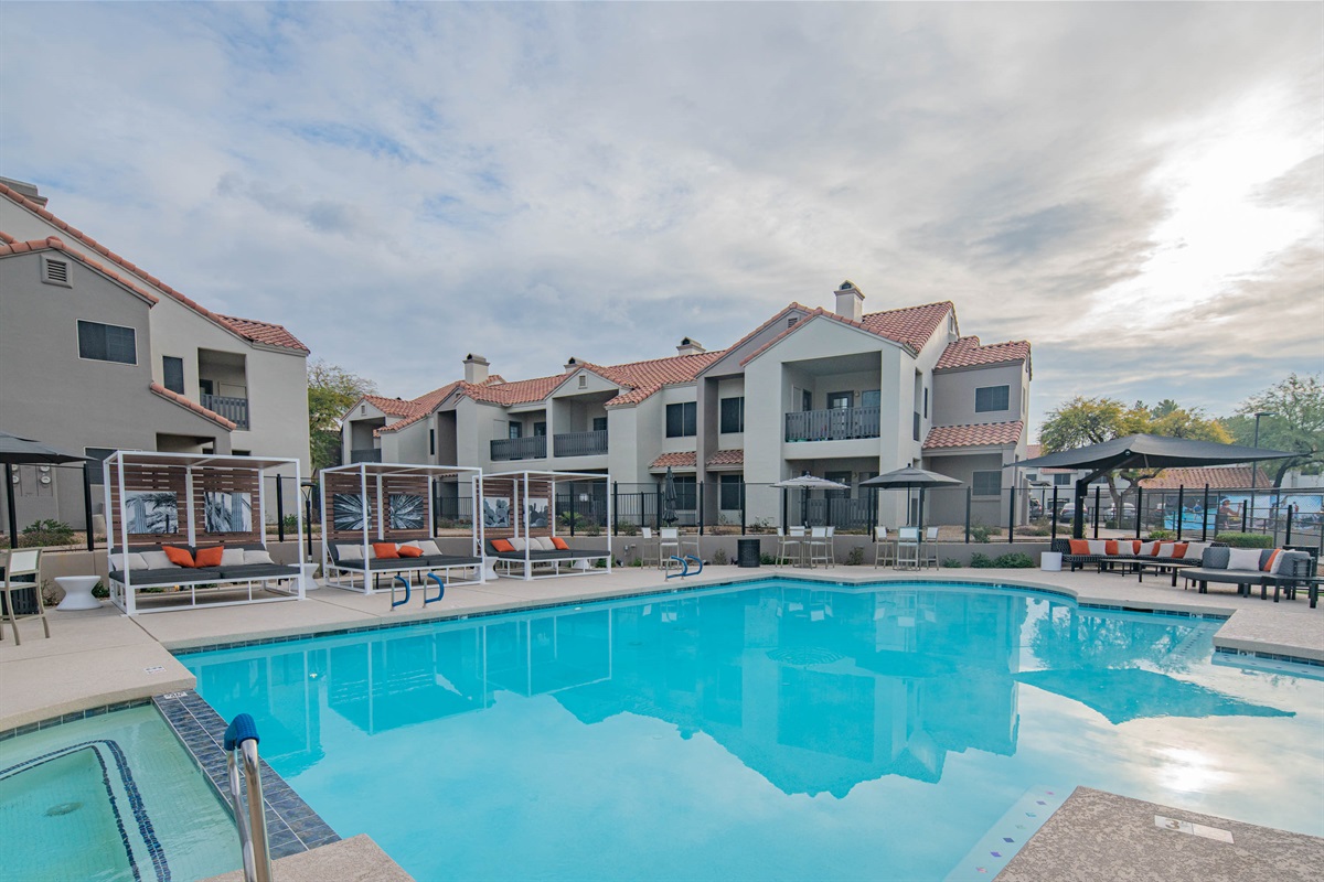 🏊 Heated resort-style pool · 💦 spa hot tub · 🌴 cabanas